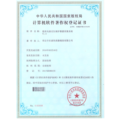 計算機軟件注冊權(quán)登記證書——整流電源過壓保護數(shù)據(jù)采集系統(tǒng)V1.0