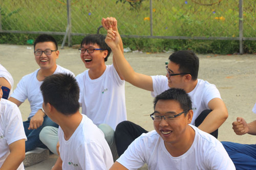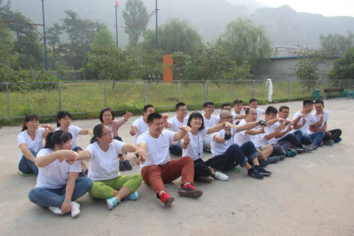 我們先進行了拓展前的熱身活動,兩個簡單的小游戲消除了大家彼此間的陌生感,活躍了氣氛。然后,大家被教練分成兩組,并被要求在半小時內(nèi)選出隊長,取隊名,定口號,繪制隊旗,選定隊歌并擺出團隊造型。大家都集思廣益,分工合作,各顯其能。